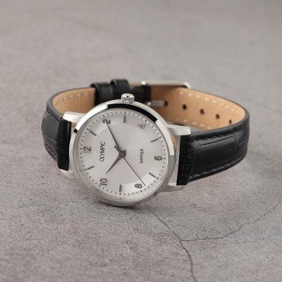 This Olympic watch has a case made of stainless steel with a diameter of 29 mm and is fitted with a leather band. Inside the case lies a Miyota movement and the watch features a Sapphire crystal.