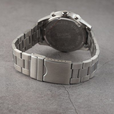 This Olympic watch has a case made of stainless steel with a diameter of 44 mm and is fitted with a stainless steel band. Inside the case lies a Seiko Instruments Inc. movement and the watch features a Mineral crystal.