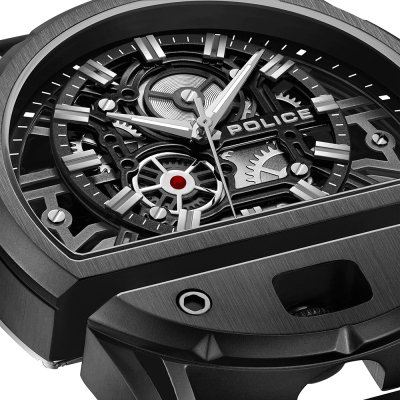 This Police watch has a case made of stainless steel with a diameter of 46 mm and is fitted with a rubber band. Inside the case lies a Miyota movement and the watch features a Mineral crystal.