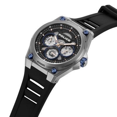 This Police watch has a case made of stainless steel with a diameter of 45 mm and is fitted with a rubber band. Inside the case lies a Seiko Instruments Inc. movement and the watch features a Mineral crystal.