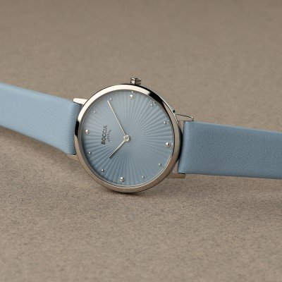 Este relógio Boccia tem uma caixa de Titânio com um diâmetro de 34 mm e está equipado com uma bracelete de couro. A caixa possui um movimento Miyota e o relógio tem um vidro Mineral.