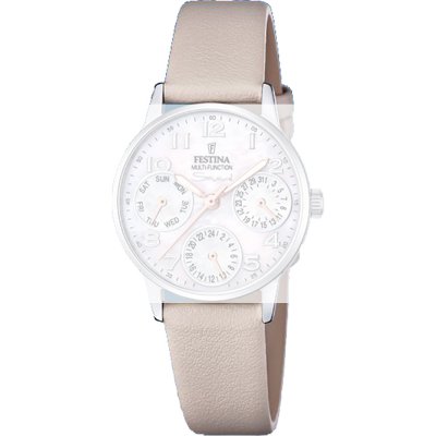Esta bracelete de relógio Festina é feita de couro e está fixada ao relógio através de pinos de pressão. A bracelete tem uma largura de 15 mm e fecha através de fecho. A bracelete tem uma montagem a direito, o que significa que esta bracelete é adequada para todos os relógios Festina com montagem da bracelete a direito.