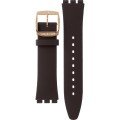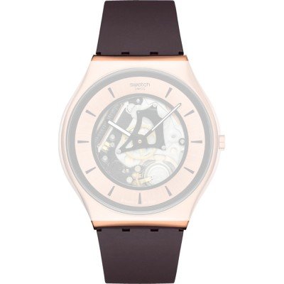 Esta bracelete de relógio Swatch é feita de borracha e está fixada ao relógio através de pinos em aço. A bracelete tem uma largura de 20 mm e fecha através de fecho. A bracelete não tem uma montagem a direito, o que significa que esta bracelete só é adequada para os relógios listados abaixo.