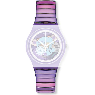 Esta bracelete de relógio Swatch é feita de aço inoxidável e está fixada ao relógio através de pinos em aço. A bracelete tem uma largura de 17 mm. A bracelete não tem uma montagem a direito, o que significa que esta bracelete só é adequada para os relógios listados abaixo.