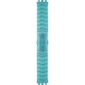 Esta bracelete de relógio Swatch é feita de plástico de origem biológica e está fixada ao relógio através de pinos em aço. A bracelete tem uma largura de 19.7 mm e fecha através de fivela butterfly com botões de pressão. A bracelete não tem uma montagem a direito, o que significa que esta bracelete só é adequada para os relógios listados abaixo.