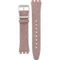 Esta bracelete de relógio Swatch é feita de couro e está fixada ao relógio através de pinos em aço. A bracelete tem uma largura de 17 mm e fecha através de fecho. A bracelete não tem uma montagem a direito, o que significa que esta bracelete só é adequada para os relógios listados abaixo.