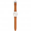 Esta bracelete de relógio Swatch é feita de couro e está fixada ao relógio através de pinos em aço. A bracelete tem uma largura de 18.9 mm e fecha através de fivela desdobrável. A bracelete não tem uma montagem a direito, o que significa que esta bracelete só é adequada para os relógios listados abaixo.