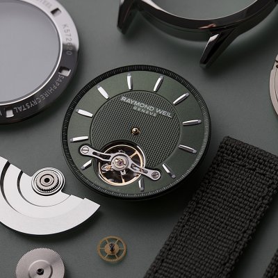 This Raymond Weil watch has a case made of stainless steel with a diameter of 42 mm and is fitted with a Textile over leather band. Inside the case lies a Sellita movement and the watch features a Sapphire crystal.
