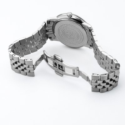 This Roamer watch has a case made of stainless steel with a diameter of 40 mm and is fitted with a stainless steel band. Inside the case lies a Ronda movement and the watch features a Sapphire crystal.