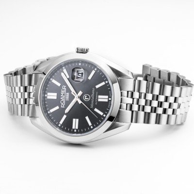 This Roamer watch has a case made of stainless steel with a diameter of 41.5 mm and is fitted with a stainless steel band. Inside the case lies a Soprod movement and the watch features a Sapphire crystal.