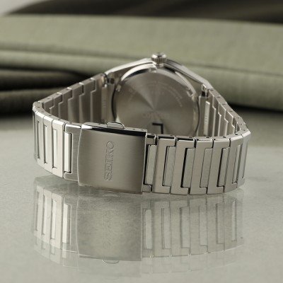 This Seiko watch has a case made of stainless steel with a diameter of 38.9 mm and is fitted with a stainless steel band. Inside the case lies a Seiko movement and the watch features a Sapphire crystal.