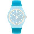 This Swatch watch strap is made of silicone and is attached to the watch by means of steel pins. The band has a width of 19.7 mm and is closed by means of a buckle. The strap has no straight mount which means that this strap is only suitable for the watches listed below.