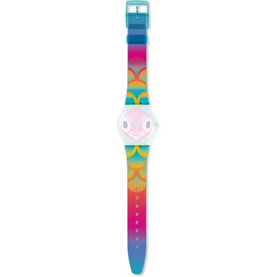 This Swatch watch strap is made of plastic/Resin and is attached to the watch by means of steel pins. The band has a width of 17 mm and is closed by means of a buckle. The strap has no straight mount which means that this strap is only suitable for the watches listed below.