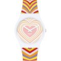 This Swatch watch strap is made of silicone and is attached to the watch by means of steel pins. The band has a width of 17 mm and is closed by means of a buckle. The strap has no straight mount which means that this strap is only suitable for the watches listed below.