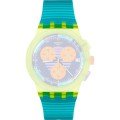 This Swatch watch strap is made of silicone and is attached to the watch by means of steel pins. The band has a width of 20.1 mm and is closed by means of a buckle. The strap has no straight mount which means that this strap is only suitable for the watches listed below.