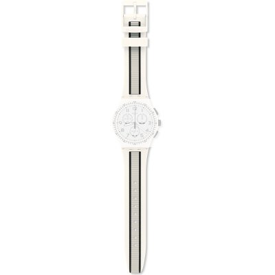 This Swatch watch strap is made of silicone and is attached to the watch by means of steel pins. The band has a width of 20.1 mm and is closed by means of a buckle. The strap has no straight mount which means that this strap is only suitable for the watches listed below.