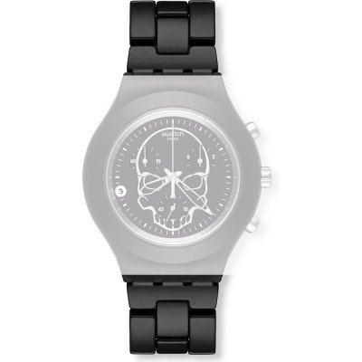 This Swatch watch strap is made of aluminum and is attached to the watch by means of steel pins. The band has a width of 19.9 mm and is closed by means of a deployment clasp with push buttons and safety. The strap has no straight mount which means that this strap is only suitable for the watches listed below.