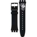 This Swatch watch strap is made of silicone and is attached to the watch by means of steel pins. The band has a width of 19.7 mm and is closed by means of a buckle. The strap has no straight mount which means that this strap is only suitable for the watches listed below.