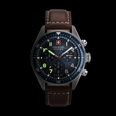 This Swiss Military Hanowa watch has a case made of stainless steel with a diameter of 43 mm and is fitted with a leather band. Inside the case lies a Ronda movement and the watch features a Sapphire crystal.