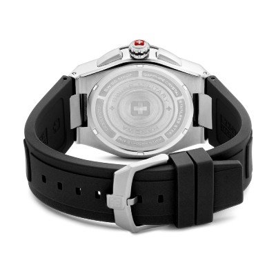 This Swiss Military Hanowa watch has a case made of stainless steel with a diameter of 43 mm and is fitted with a rubber band. Inside the case lies a Ronda movement and the watch features a Sapphire crystal.