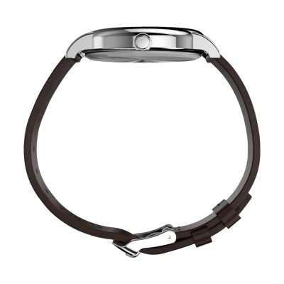 This Timex watch has a case made of metal alloy with a diameter of 38 mm and is fitted with a leather band. Inside the case lies a Timex movement and the watch features a Mineral crystal.