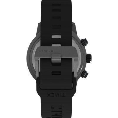 This Timex watch has a case made of stainless steel with a diameter of 44 mm and is fitted with a rubber band. Inside the case lies a Timex movement and the watch features a Mineral crystal.