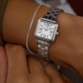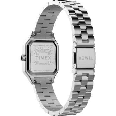 This Timex watch has a case made of metal alloy with a diameter of 23 mm and is fitted with a stainless steel band. Inside the case lies a Timex movement and the watch features a Mineral crystal.