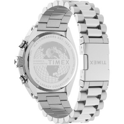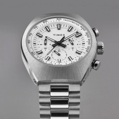 This Timex watch has a case made of stainless steel with a diameter of 42 mm and is fitted with a metal band. Inside the case lies a Timex movement and the watch features a Mineral crystal.