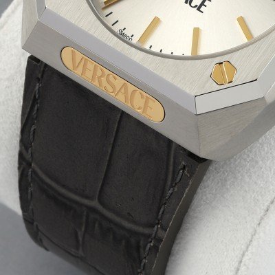 This Versace watch has a case made of stainless steel with a diameter of 41 mm and is fitted with a leather band. Inside the case lies a Ronda movement and the watch features a Sapphire crystal.