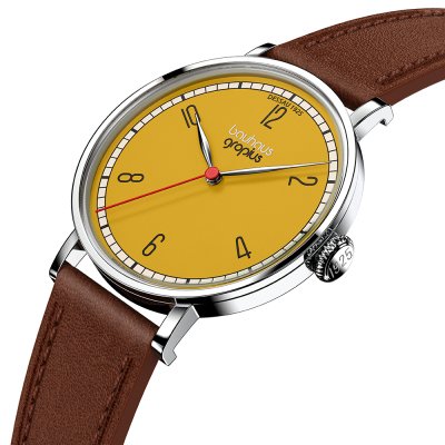 This Walter Gropius watch has a case made of stainless steel with a diameter of 38 mm and is fitted with a leather band. Inside the case lies a Miyota movement and the watch features a Double anti-reflective sapphire crystal.