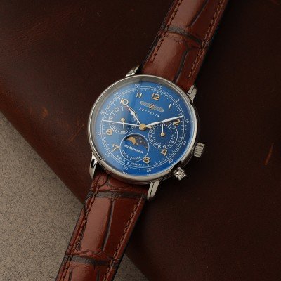 This Zeppelin watch has a case made of stainless steel with a diameter of 36 mm and is fitted with a leather band. Inside the case lies a Ronda movement and the watch features a K1 Mineral crystal.