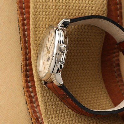 This Zeppelin watch has a case made of stainless steel with a diameter of 36 mm and is fitted with a leather band. Inside the case lies a Ronda movement and the watch features a K1 Mineral crystal.